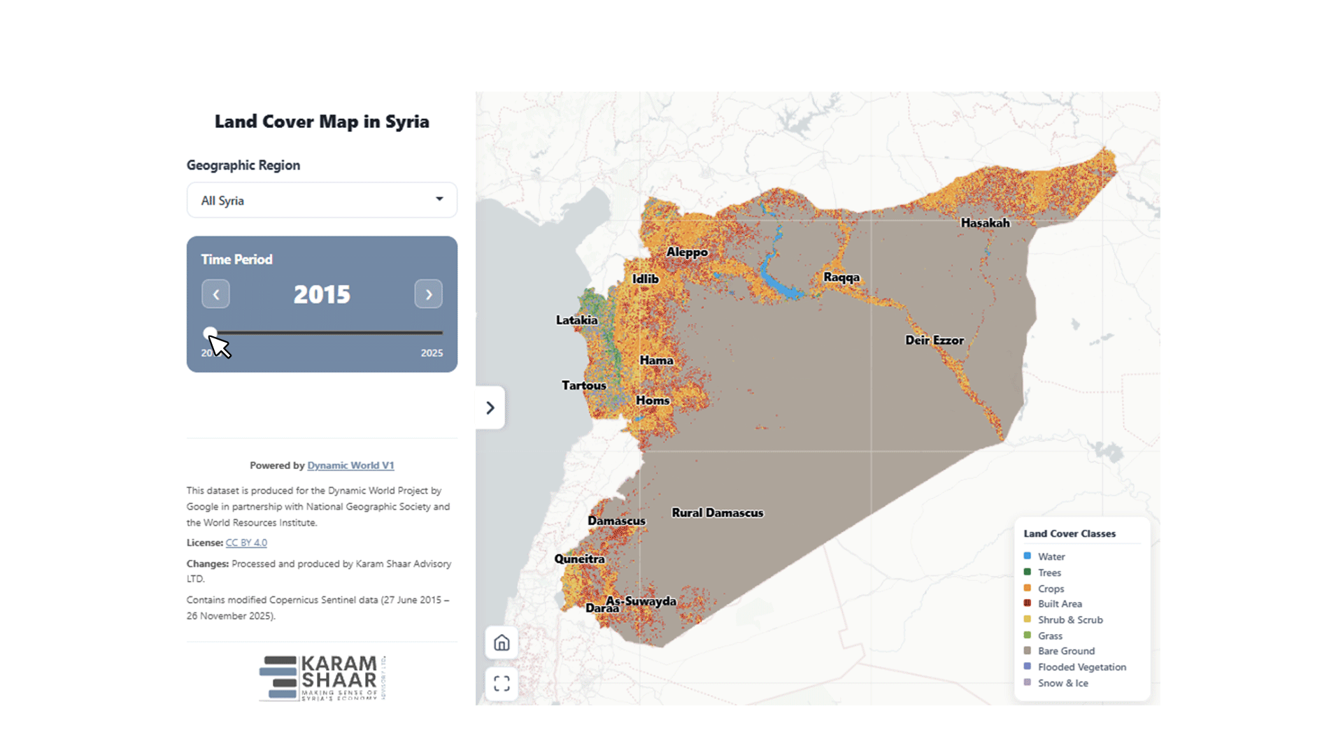 Interactive map visualizing land-cover changes across Syria from 2015–2025, including crops, trees, built-up areas, water bodies, shrublands, and barren land, with the ability to explore trends by governorate and over time.